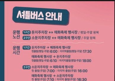 - 노선 1: 둔지주차장 ⇔ 매화축제 행사장 (평일-주말 왕복 운행)