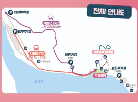 - 노선 2: 소둔지주차장 ⇔ 매화축제 행사장 (주말 왕복 운행)