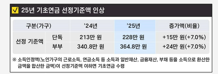 2025년 노인 단독가구, 소득인정액 월 228만원 이하면 기초연금을 받습니다.